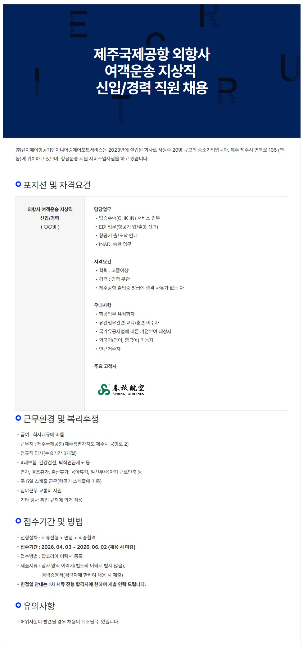 [㈜큐지에이] 제주국제공항 외항사 여객운송 지상직 신입/경력 직원 채용 - 고졸이상