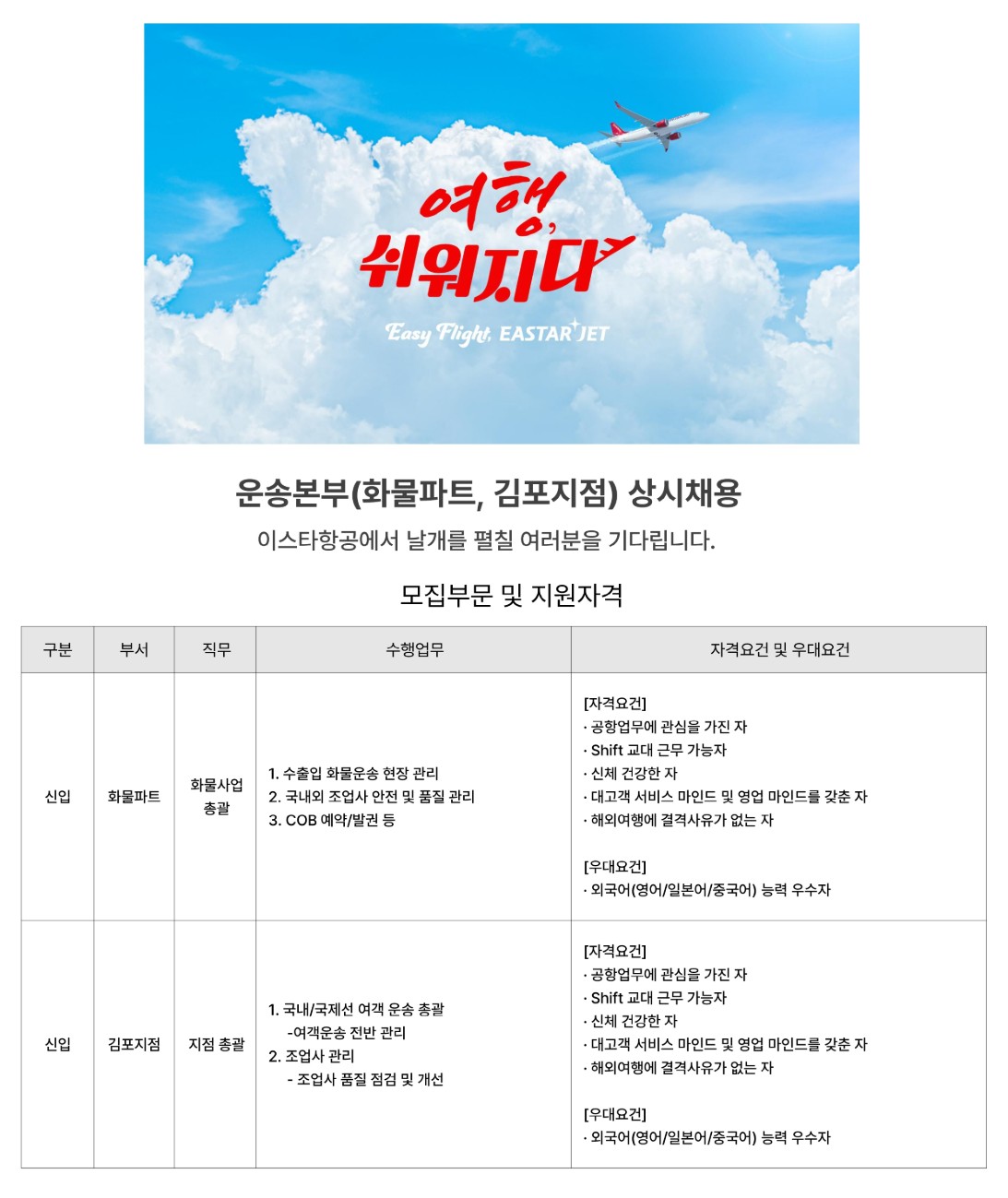 [이스타항공] 운송본부(화물파트, 김포지점) 대졸공채 상시채용