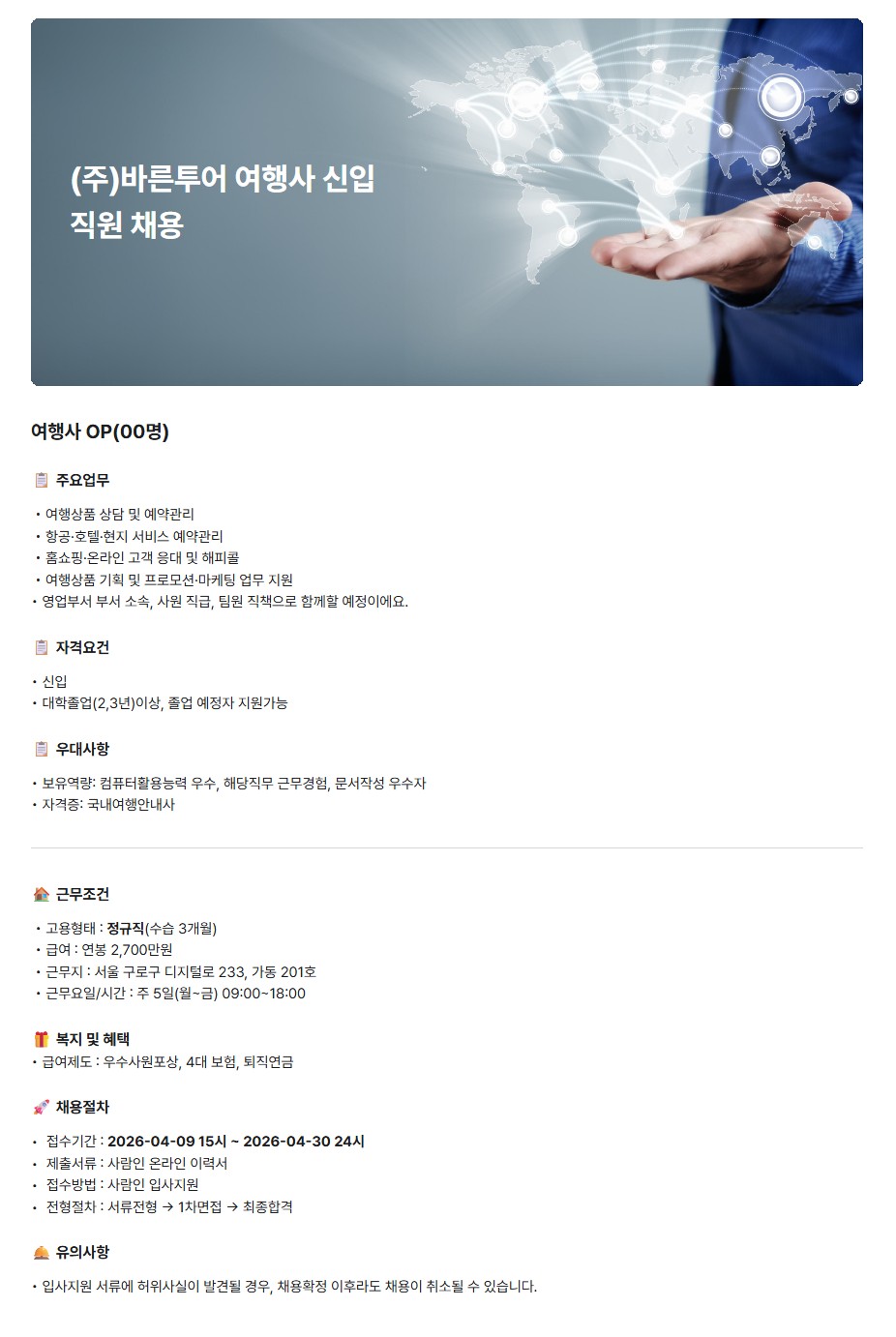 (주)바른투어 여행사 신입 직원 채용