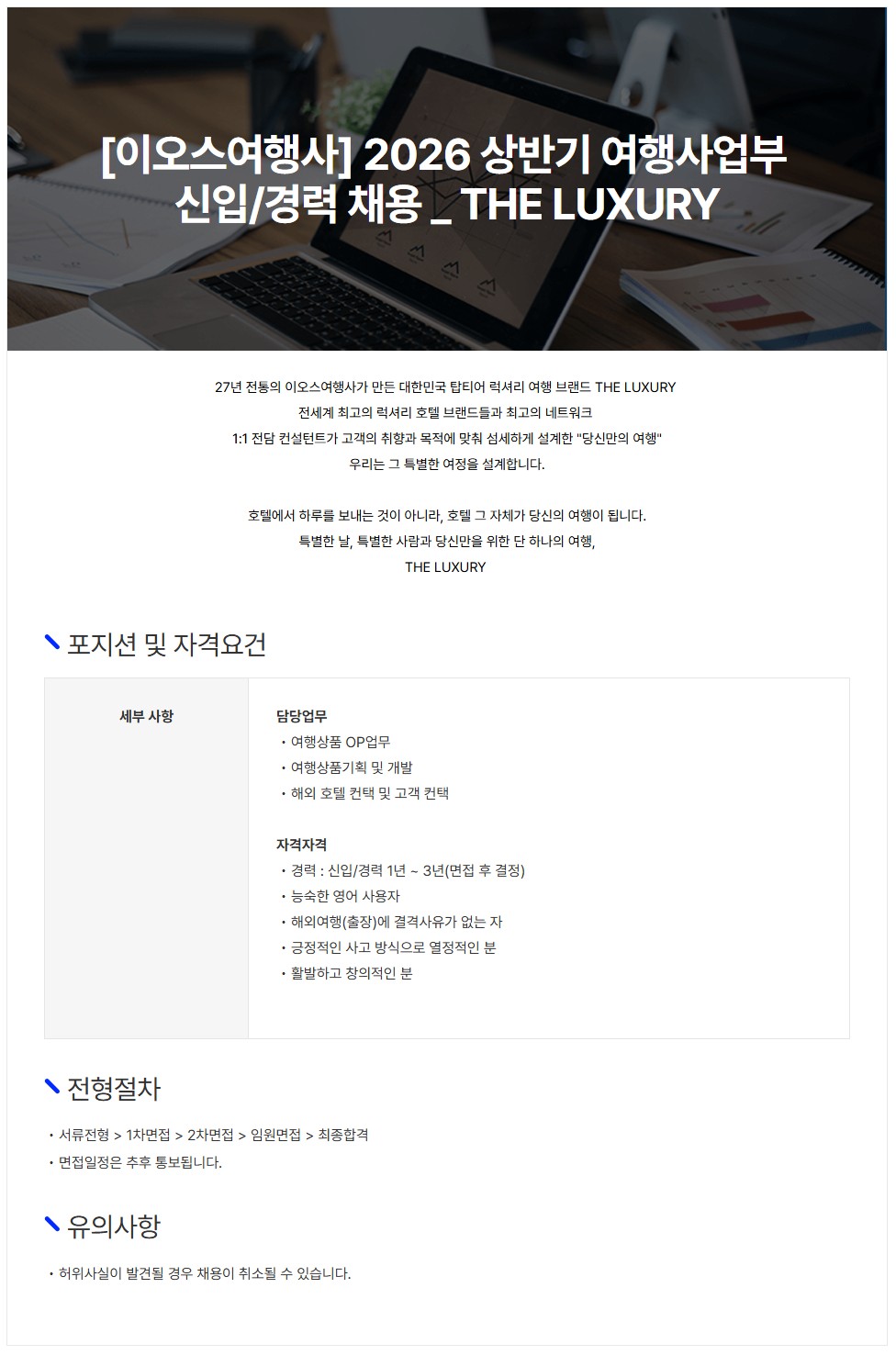 [이오스여행사] 2026 상반기 여행사업부 신입/경력 채용 THE LUXURY