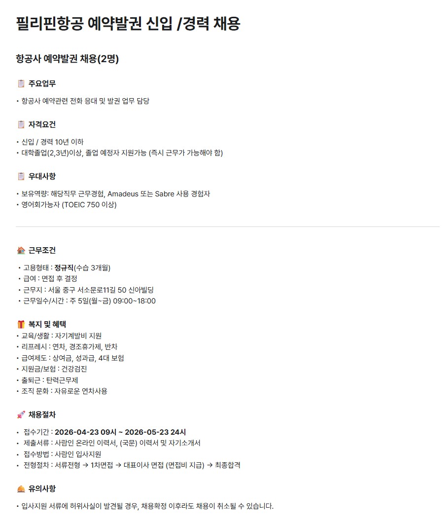 [필리핀항공] 지상직 예약발권 신입 /경력 채용