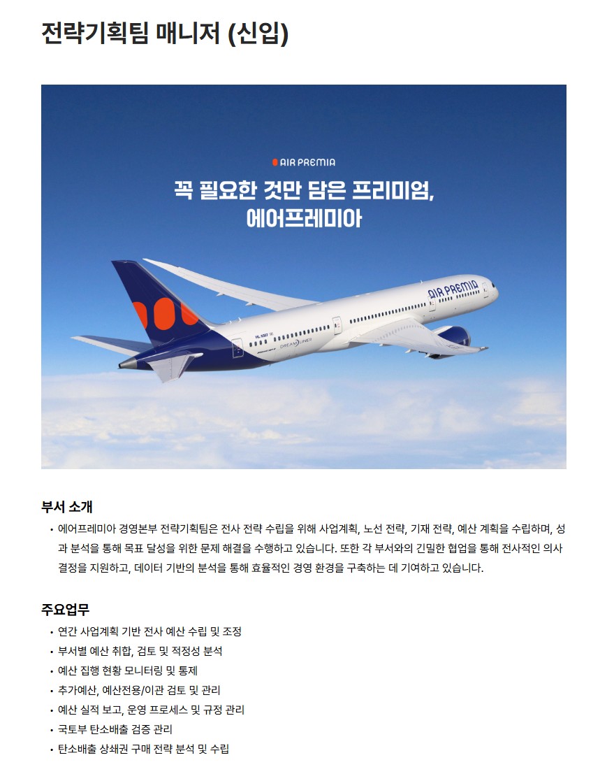 [에어프레미아] 일반직 대졸공채 전략기획팀 매니저 (신입)
