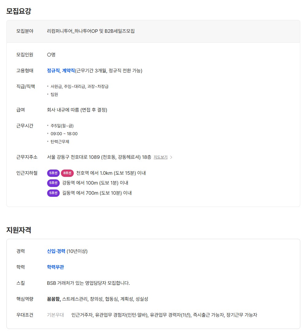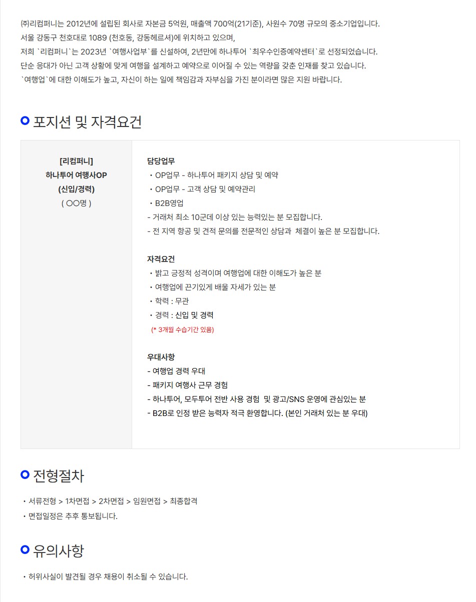 [리컴퍼니투어] 하나투어 여행사 OP 및 B2B세일즈 모집