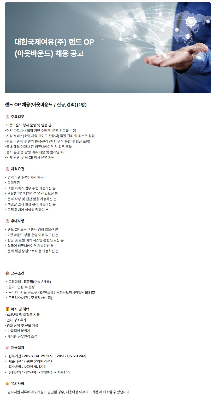 [대한국제여유(주)] 여행사 랜드 OP(아웃바운드) 채용 공고