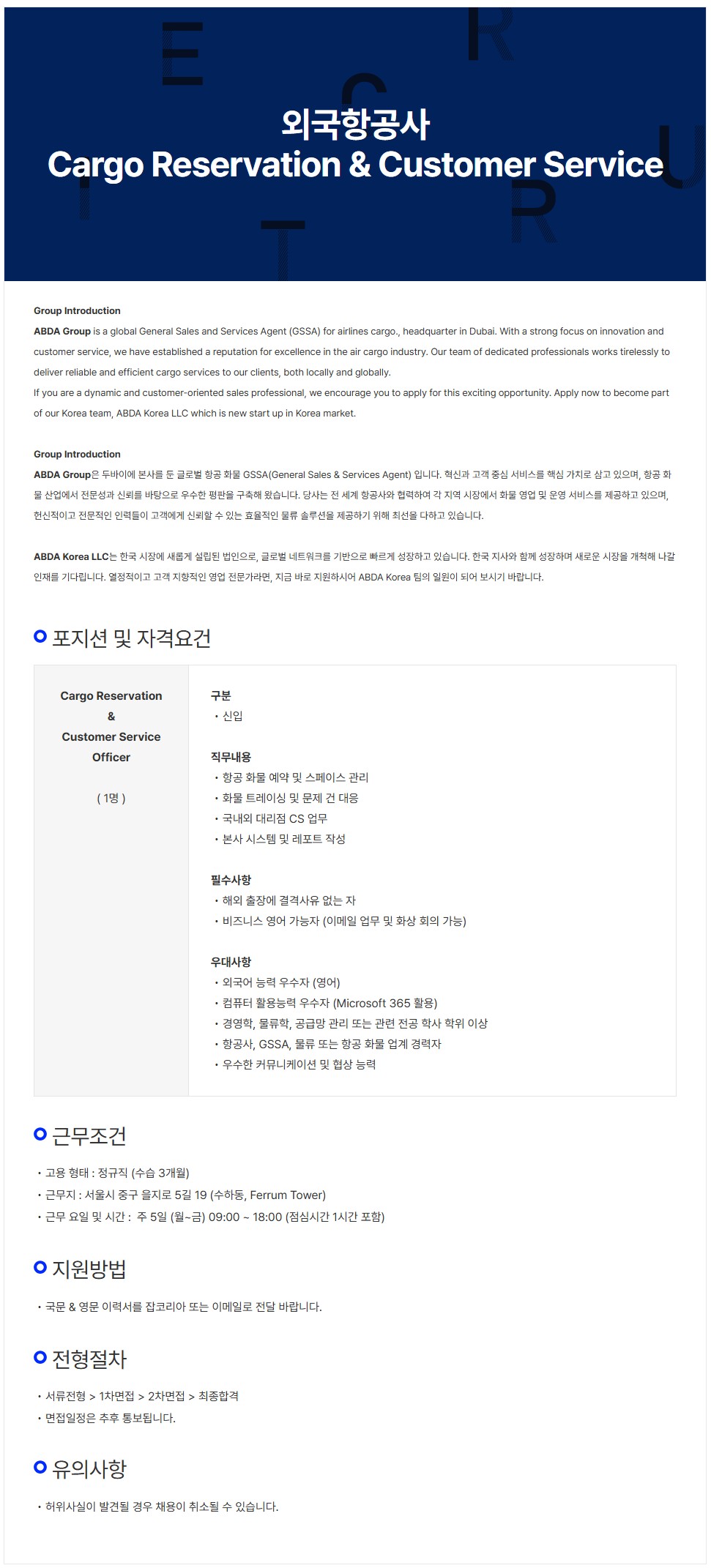 [에이비디에이코리아] 외국항공사 Cargo Reservation & Customer Service 채용